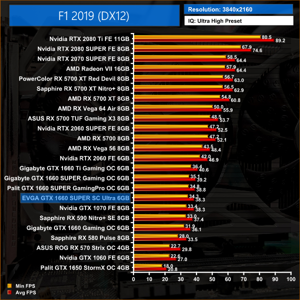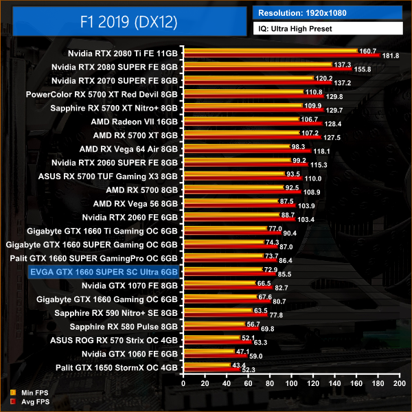 Just 1.5FPS separates the EVGA SC Ultra from the Gigabyte Gaming OC when playing F1 2019 at 1080p, so this card is still pushing over 80FPS on average.