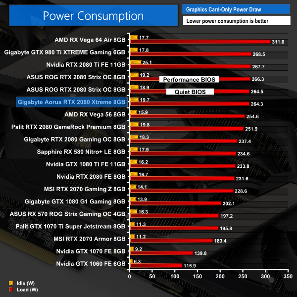 Power consumption levels are more of what we would expect – it is a heavily factory overclocked card so around the 264W model really is par for the course. You can also see just how close it is to the ASUS ROG Strix 2080 – another factory overclocked model – in terms of power draw.