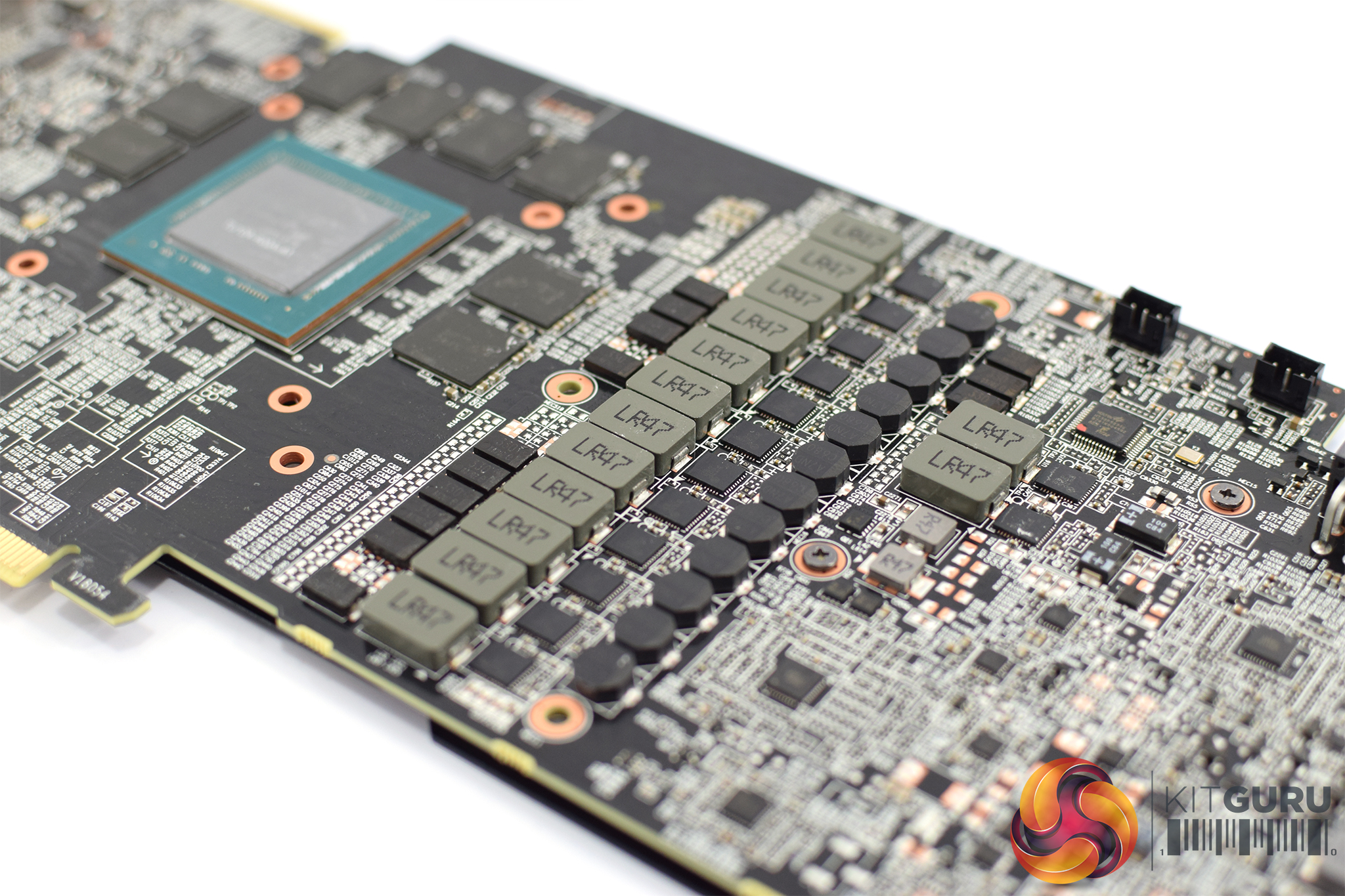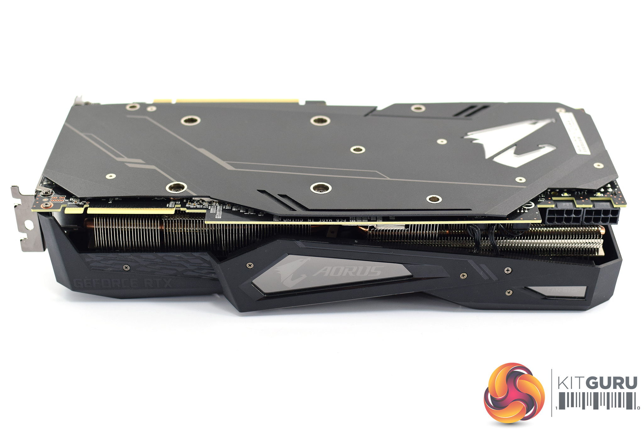 Opening up the card requires the removal of ten screws from the back of the card. This reveals a very busy-looking PCB, and the standout thing here is the mammoth 12+2 power phase design Aorus has opted for. The Founders Edition 2080, for reference, ‘only' uses 8+2 power phases, so Aorus has clearly gone overboard which it claims should help with ‘extreme overclocking'.