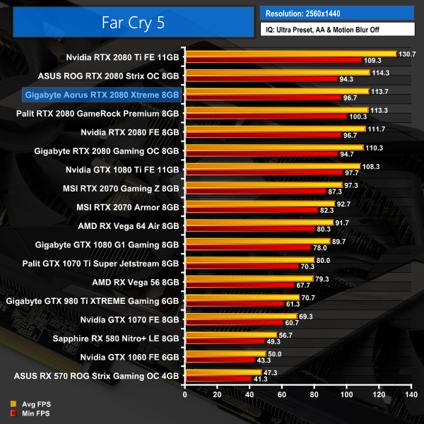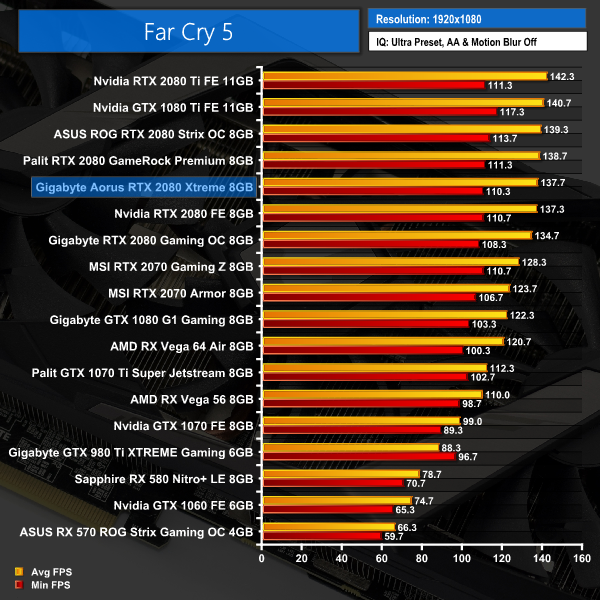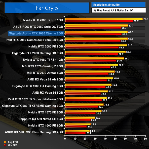 Despite the anomaly at 1080p, Far Cry 5 again shows the Aorus 2080 slotting in just behind the ASUS ROG Strix model, though it is just a fraction of an FPS faster than the Palit GameRock Premium card.