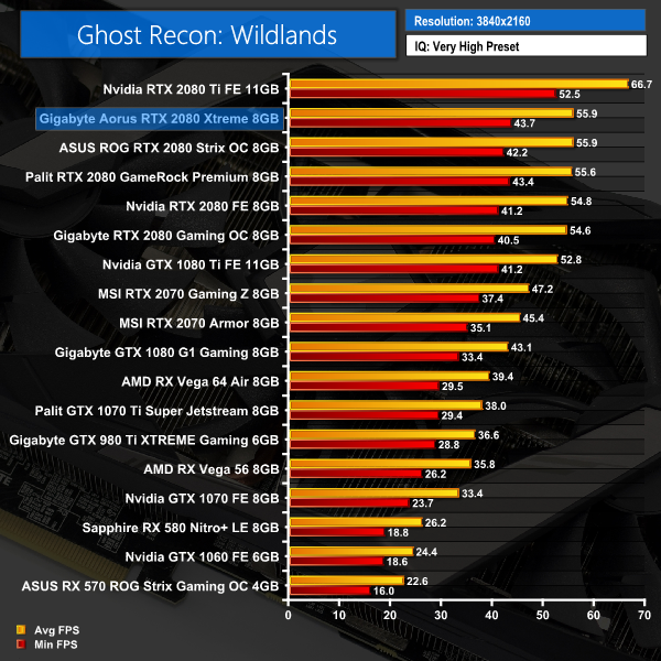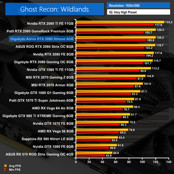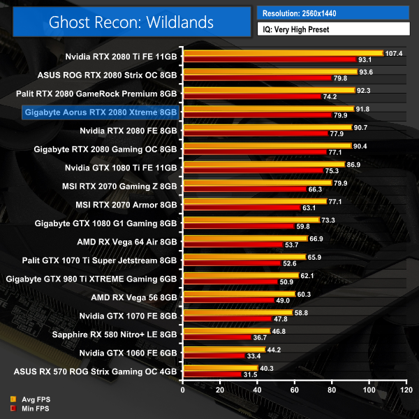 Ghost Recon: Wildlands is another mixed bag, with all three of the top RTX 2080s trading places depending on the resolution. You can see, however, that even though one card may be faster than the others, the differences really are not big at all.