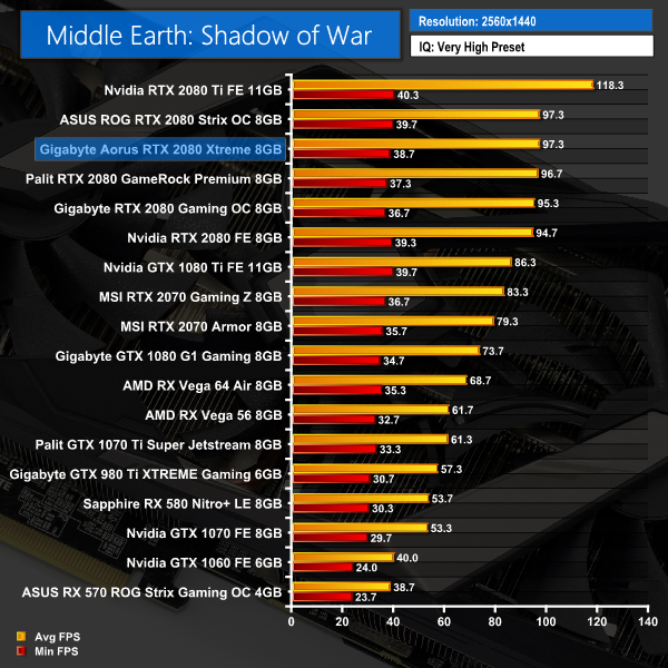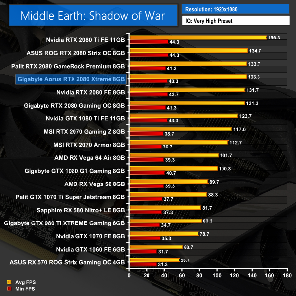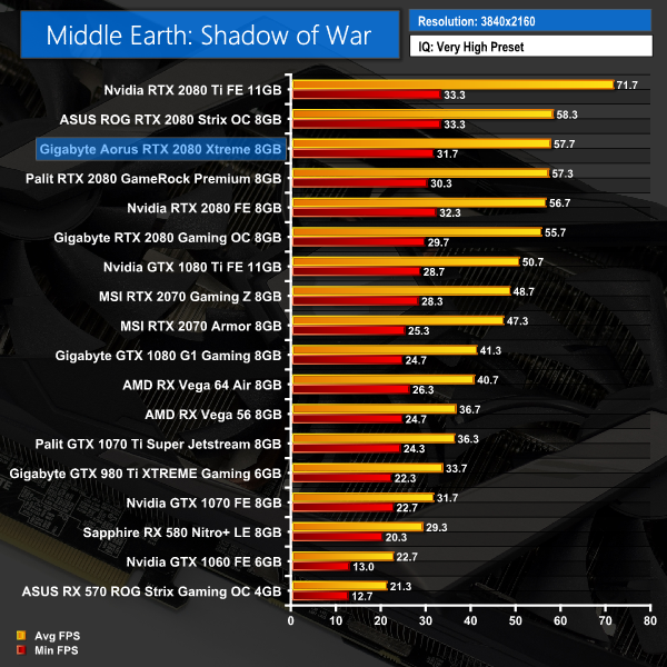 At 1080p when playing Middle Earth: Shadow of War, the Aorus falls just behind the Palit RTX 2080, but at both 1440p and 2160p it just edges ahead. The ASUS ROG Strix card, though, is still marginally faster.
