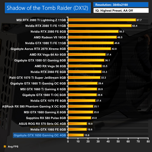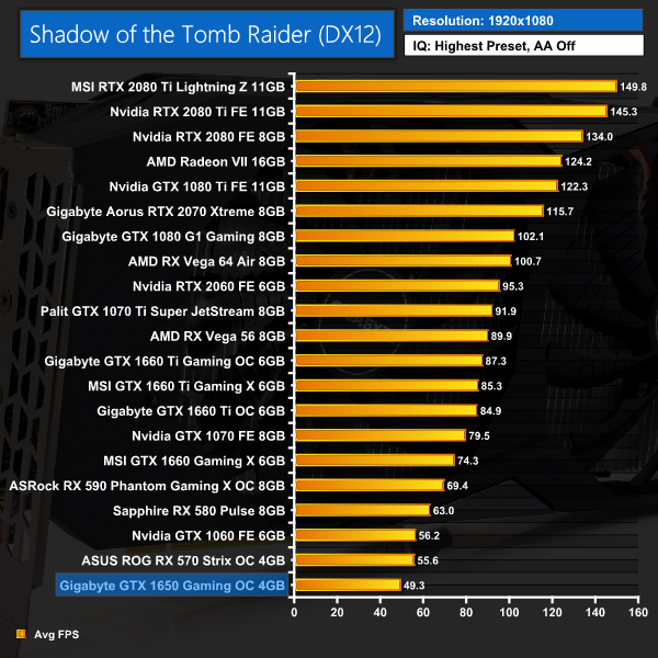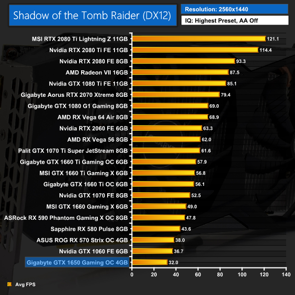 Rounding out our games testing, Shadow of the Tomb Raider doesn't deviate from the trend we have observed so far – GTX 1650 comes in bottom of the pile, around 6FPS slower than the RX 570 when gaming at 1080p. With an average frame rate of 32FPS, gaming at 1440p is also a pretty choppy experience.