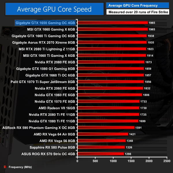 To Gigabyte's credit, the Gaming OC 4G does boost well beyond its rated boost clock of 1815MHz – instead averaging 1965MHz. We've not yet tested any other GTX 1650 models, but it is likely this will be one of the fastest out-of-the-box clock speeds we will see. Remember though, not all GTX 1650 are created equal – cards that adhere to the 75W TDP will likely run a bit slower, when this model has an additional 6-pin power connector with a TDP of 105W.