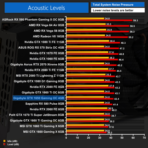 What the temperature charts don't tell you, however, is how loud the card is running to achieve its low peak temperature of 59C. Now, to be clear, the 42dB of noise produced by this card is still a good result – it is still audible, but it is far from the loudest card I've heard.