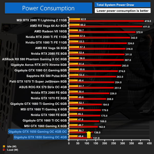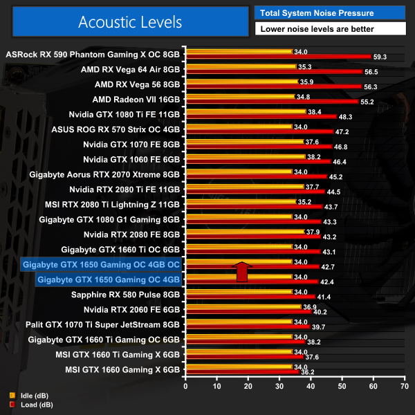 To Gigabyte's credit, the extra frequency barely affected the Gaming OC 4G. Temperatures rose by just 1C, and noise levels were essentially unchanged from the stock result. Power did also rise very slightly, but an extra 5W is really not going to bother anyone.