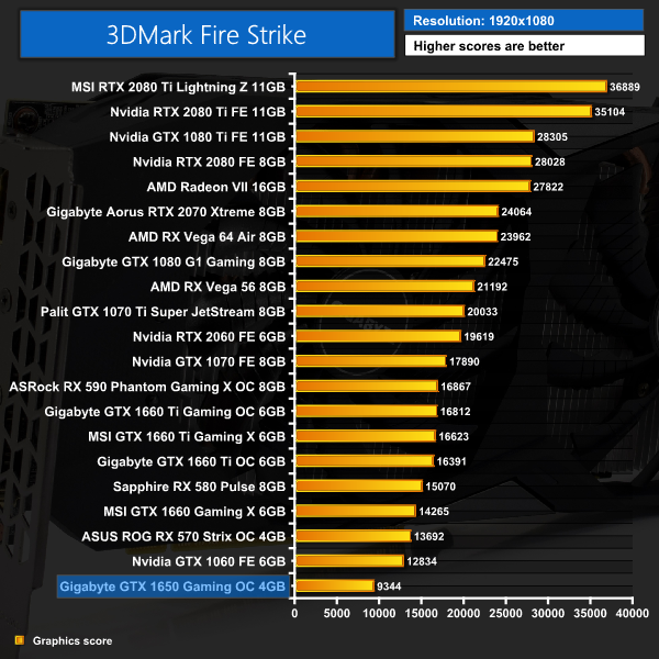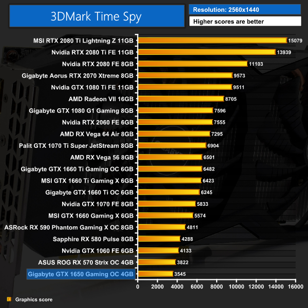 It's not the greatest start for the GTX 1650, with its results planted firmly at the bottom of our 3DMark charts. It does come closer in the DX12 Time Spy benchmark, with just a 300 point gap between itself and the RX 570, but in both Fire Strike and Fire Strike Ultra the gap is significantly wider.