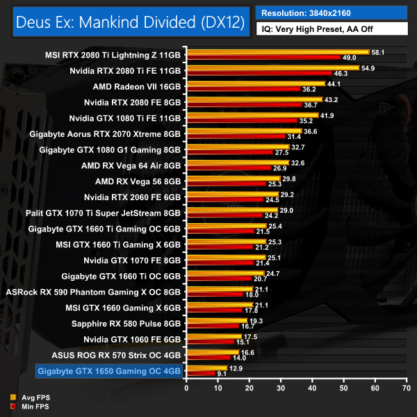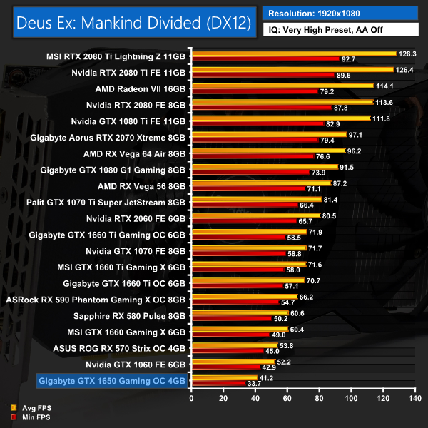 Things don't really pick up in Deus Ex: Mankind Divided, either. The GTX 1650 averaged just over 40FPS at 1080p – putting it 12-13FPS slower than both GTX 1060 and RX 570. It's 1440p results aren't playable, either, with minimums of 22.5FPS.