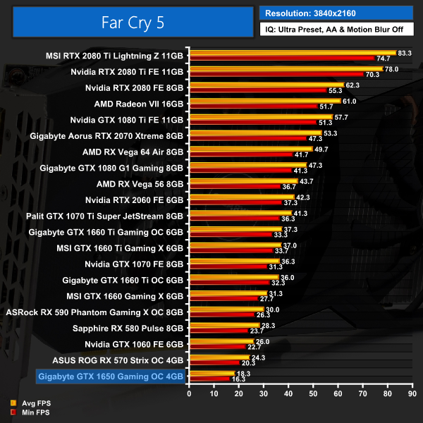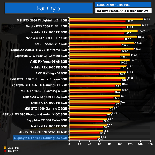 At last things to begin to look a bit better when playing Far Cry 5. Here the GTX 1650 averages over 60FPS at 1080p, which is about 5FPS slower than the RX 570 – but it is still a decent result. At 1440p we saw minimums of 36FPS which isn't too smooth, but you could just about get away with it.