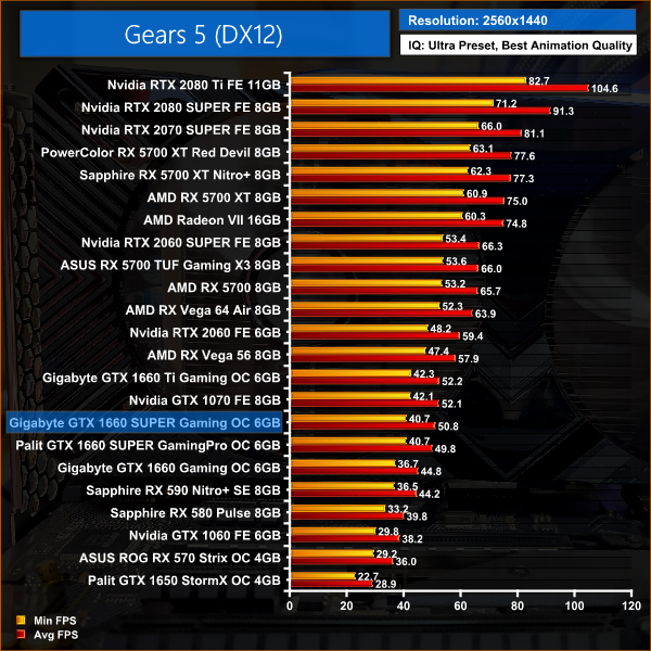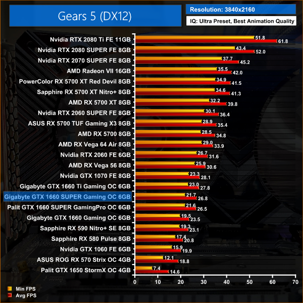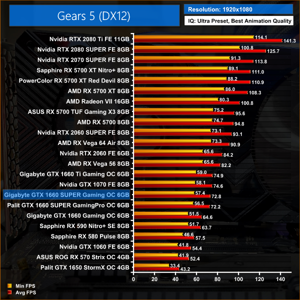 Gears 5 continues with decent gains for the 1660 SUPER over the vanilla 1660, here the new card is 13% faster. Up against the 1660 Ti, there's just 3% in it.