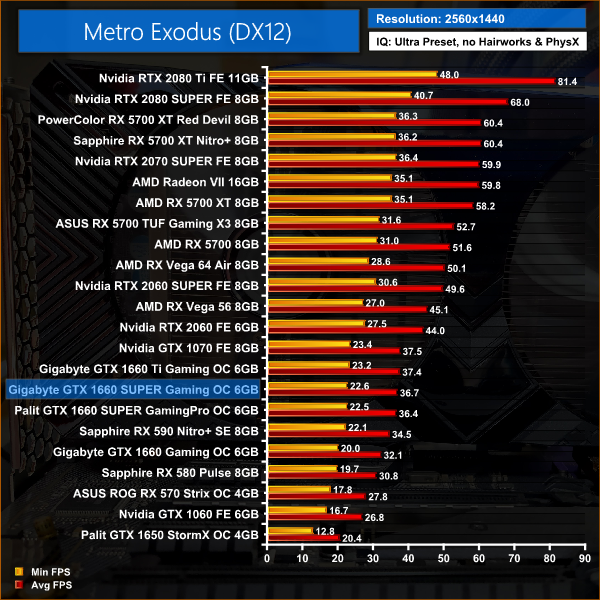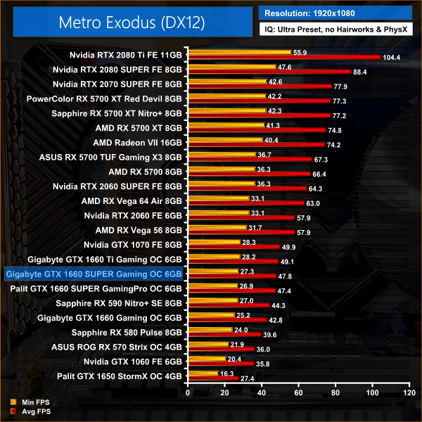 GTX 1660 SUPER outperforms 1660 by increasing margins as we step up in resolution with Metro Exodus – it's 12% faster at 1080p, 14% faster at 1440p and 19% faster at 4K. Compared to GTX 1660 Ti, it's no more than 3% slower.