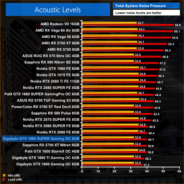 Adding to the excellent temperature results, acoustics is another impressive area for Gigabyte. When idling, the fans stop spinning, and under load we saw the fans ramp up to 50%, or around 1680rpm. There the card produced barely 40dB of noise, making it one of the quietest cards we have tested.