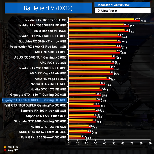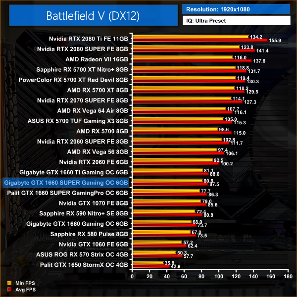 Battlefield V follows on from our 3DMark results very neatly – Gigabyte's 1660 SUPER is on average 18% faster than the 1660 in this title, while proving no more than 3% slower versus the 1660 Ti.