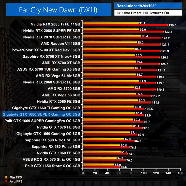 Far Cry New Dawn stretches 1660 SUPER's lead to 14% over the 1660, and it's just 2% slower than the 1660 Ti at 1440p.