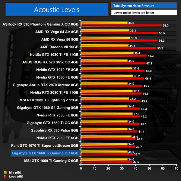 With such a large cooler (relatively speaking, at least) for this GTX 1660 Ti, not only are temperatures very low – but noise levels are also very impressive. The Gaming OC 6G isn't quite as quiet as the MSI Gaming X, but the difference is just 0.6dB – and was imperceptible to my ear. In a nutshell, it's another dead quiet card – as soon as it is put in a case, chances are you won't be able to hear it when gaming.