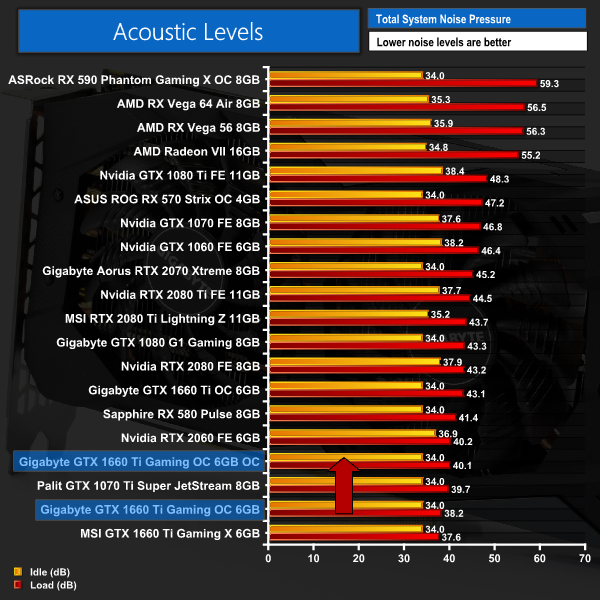 Considering how – dare I say – overkill this triple-fan cooler is for a GTX 1660 Ti, it is not really a surprise that it deals with the extra heat from our overclock without breaking sweat. Temperatures did rise, but only by 2C, and with noise output peaking at 40dB, this is still a whisper-quiet card.