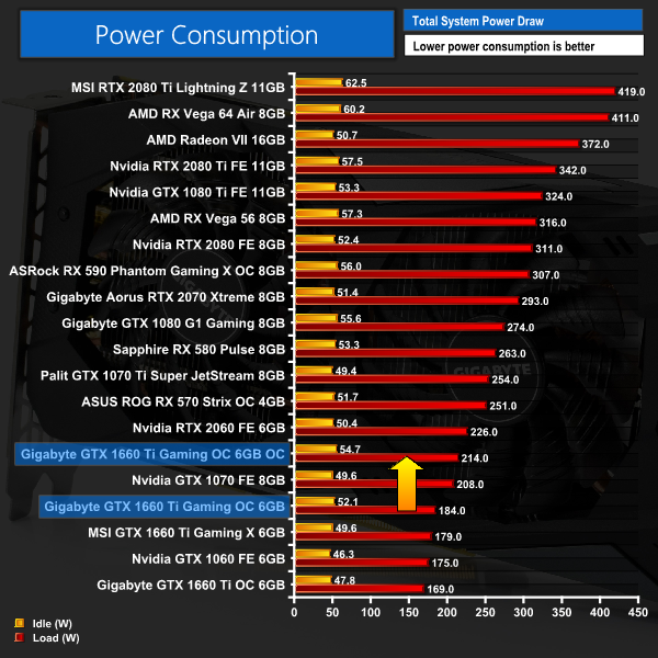 Power consumption increased the most, up to 214W – taking it past the GTX 1070. Considering how this sample was almost on par with RTX 2060 when overclocked, however, I still don't see that as much of an issue at all.