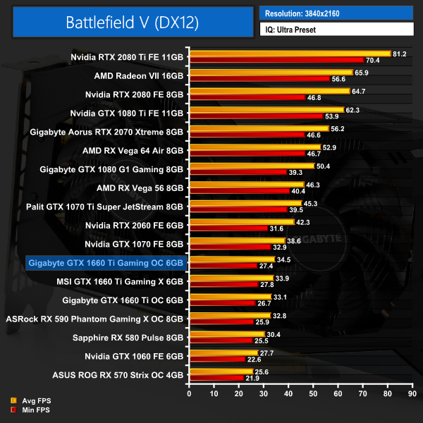 Gigabyte's Gaming OC 6G is also marginally faster than the other two 1660 Tis when we come to Battlefield V. The margins are not big, though – just 2.2FPS separates this card from the slowest 1660 Ti when gaming at 1080p.
