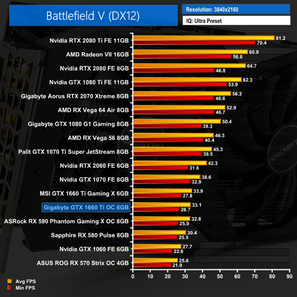 Gigabyte's GTX 1660 Ti comes in very close to the MSI Gaming X in Battlefield V. Across all resolutions, the performance difference is never more than 1FPS on average.