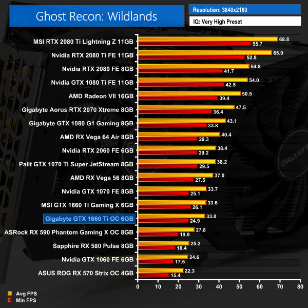 Ghost Recon: Wildlands is known to favour Nvidia hardware over AMD cards, and that explains why this 1660 Ti performs almost exactly the same as Vega 56 at 1080p resolution. Even at 1440p, the OC 6G averages almost 60FPS here.