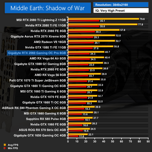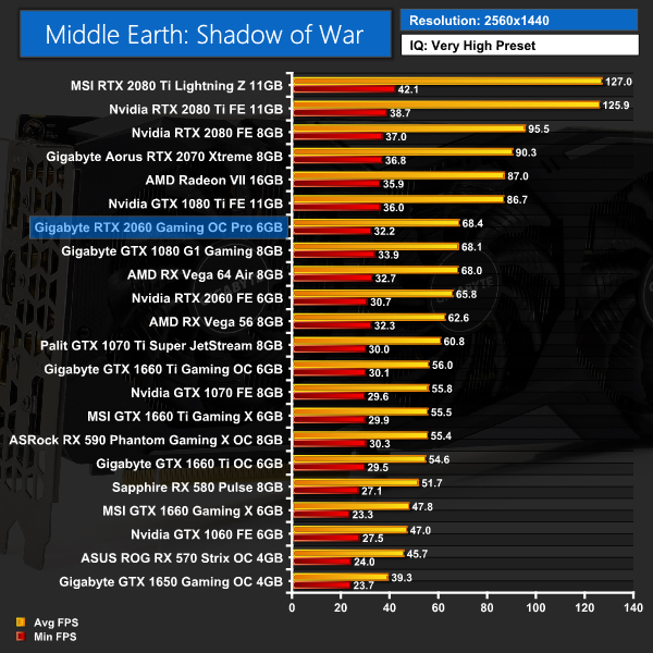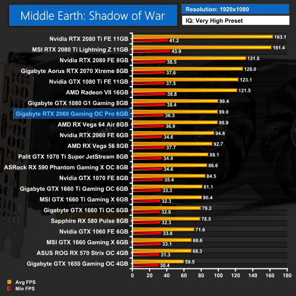 This RTX 2060 again does very well with Shadow of War, edging ahead of Vega 64 across all three resolutions tested. It's about 5FPS faster than its Founders Edition counterpart at 1080p, too.