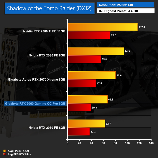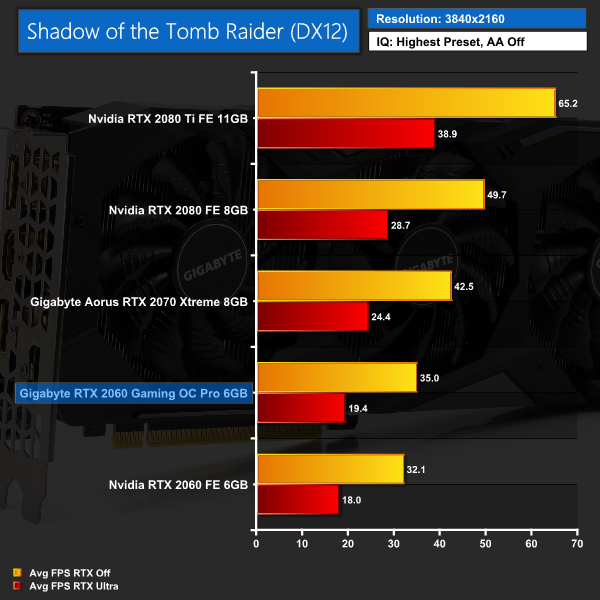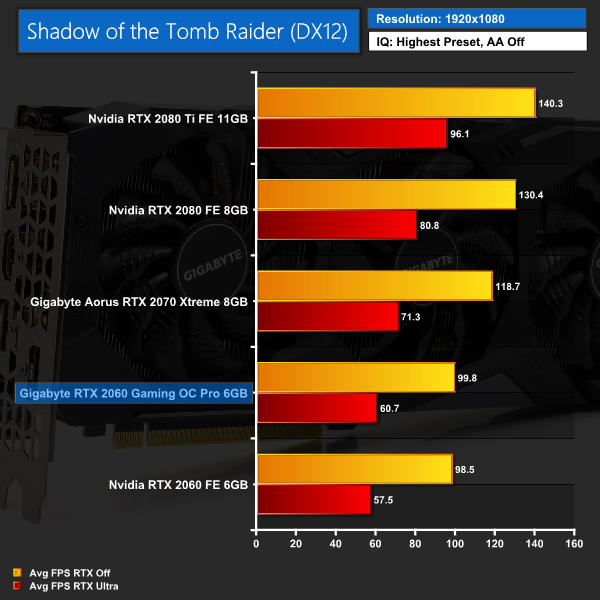 Ray traced performance is again decent at 1080p, with the Gaming OC Pro averaging almost exactly 60FPS. That's another 40% performance hit when compared to no ray racing, however, so it really depends how you'd rather play the game.