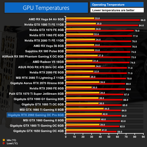This card's strong performance continues when we look at GPU temperatures. The core ran no hotter than 64C during our testing which is a fabulous result. Granted, RTX 2060 doesn't tend to run that hot but this is still great to see and marks a 5C improvement over the Founders Edition.