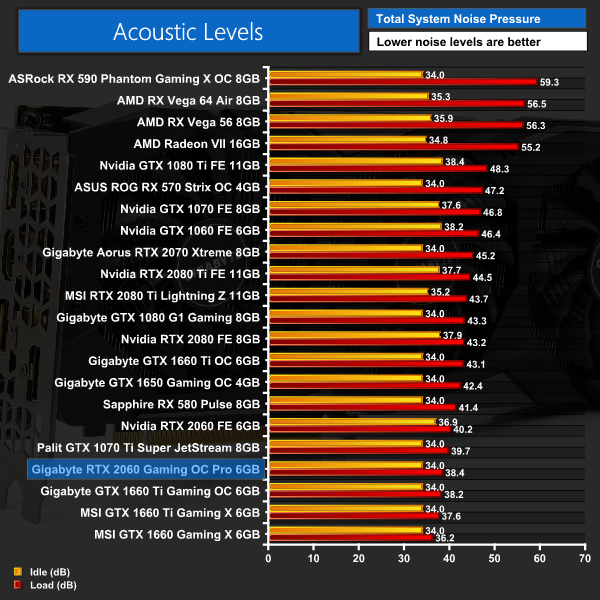 In terms of noise levels, the Gaming OC Pro is similarly excellent. It's the quietest RTX card on our chart and comes in around 2dB quieter than the Founders Edition. It's simply very hard to hear when it is actually working, so put this in a case and it will effectively be silent. Hats off to Gigabyte on this one.