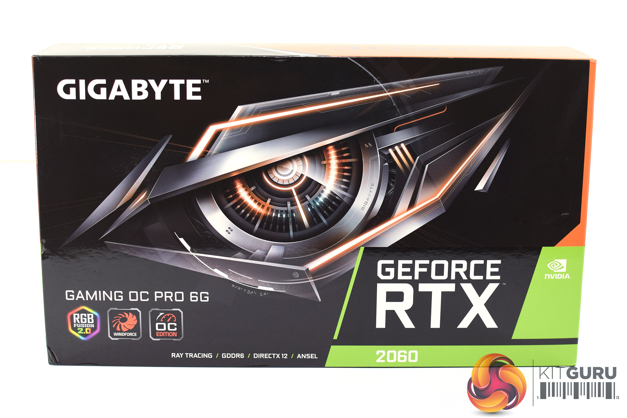 The Gigabyte RTX 2060 Gaming OC Pro 6G ships in the same sort of box as all the other Gigabyte cards we have reviewed recently – meaning it is mostly black, with the front taken up by the robotic-styled eye logo.