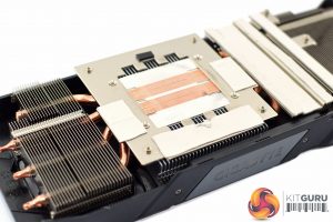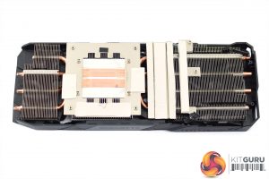 As for the cooler, this is made up of three separate aluminium fin stacks which are connected by four 6mm copper heatpipes. These heatpipes make direct contact with the GPU die, and we can also see plenty of thermal pads have been used for the memory chips and VRM.