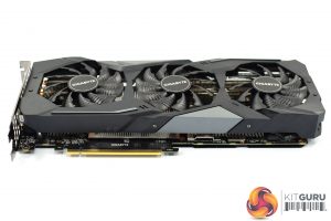 The front side of the card is home to the Gigabyte logo, and this is the only RGB zone on the card. RGB lighting clearly isn't a big focus for the Gaming OC Pro – we've seen cards from MSI and ASUS which have multiple RGB zones across the shroud and backplate – so whether you see this as a positive or a negative depends on your opinion of RGB lighting.