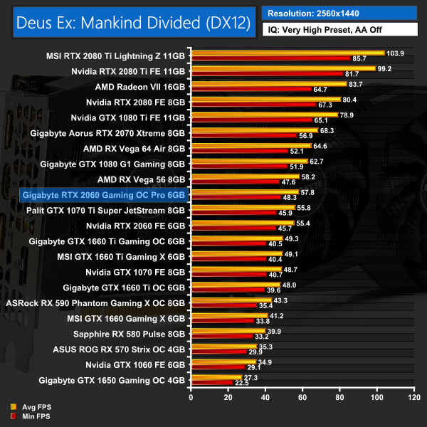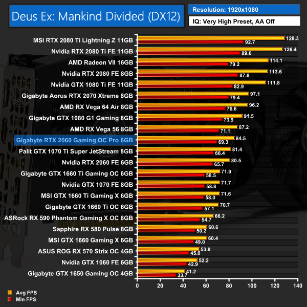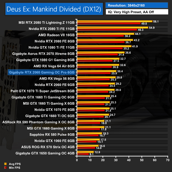 Moving to Deus Ex: Mankind Divided, the Gigabyte Gaming OC Pro again outperforms the RTX 2060 FE by a small margin – around 4FPS at 1080p. Interestingly, this is one of the titles where Vega 56 is faster than RTX 2060 – at 1080p and 1440p at least, though they are effectively tied at 4K.