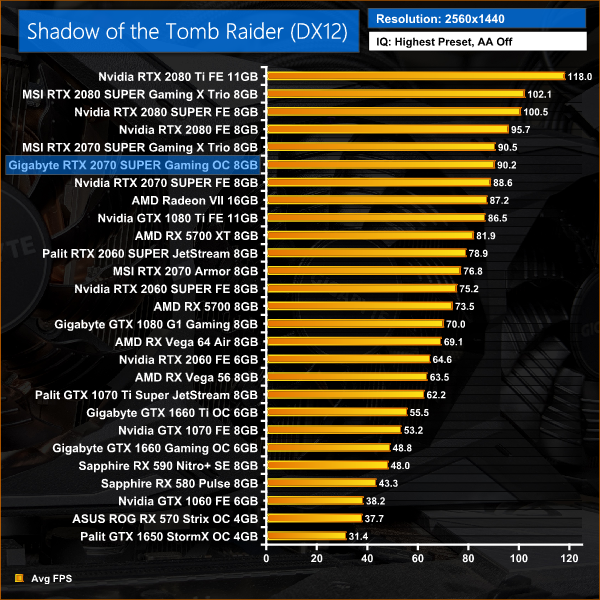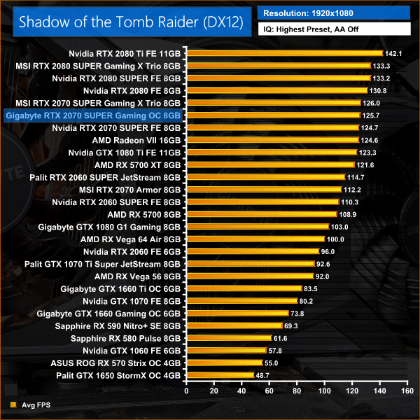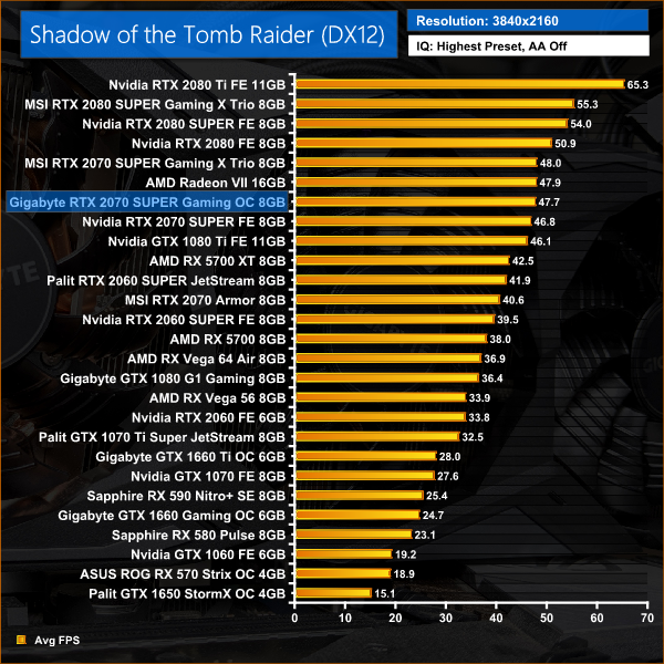 Shadow of the Tomb Raider doesn't deviate from the now well-established trend we have seen throughout this review – the Gaming OC sits right between both of the other 2070 SUPER cards we have already tested.