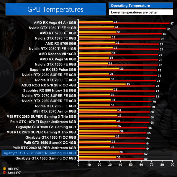 Thermal performance from the Windforce 3X cooler is nothing short of fantastic. The GPU peaked at just 62C, making it 3C cooler than the Gaming X Trio and a full 11C cooler than the Founders Edition. As we will see on the next page, it's not like Gigabyte had to run the fans particularly fast to achieve these temperatures either, so it's an all-round impressive job from Gigabyte.