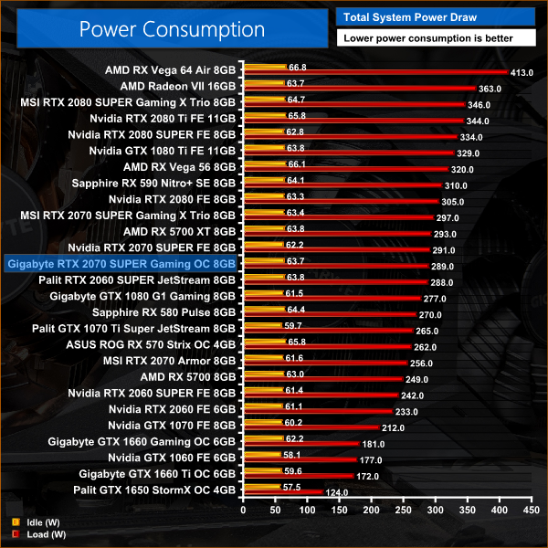As for power draw, I was slightly surprised to see this Gaming OC pull less power than the Founders Edition, but the margin proved to be just 2W so definitely within margin of error for a system-wide power consumption test. In any case, it's basically the same as the other 2070 SUPERs, with all three cards pulling with 10W of each other.