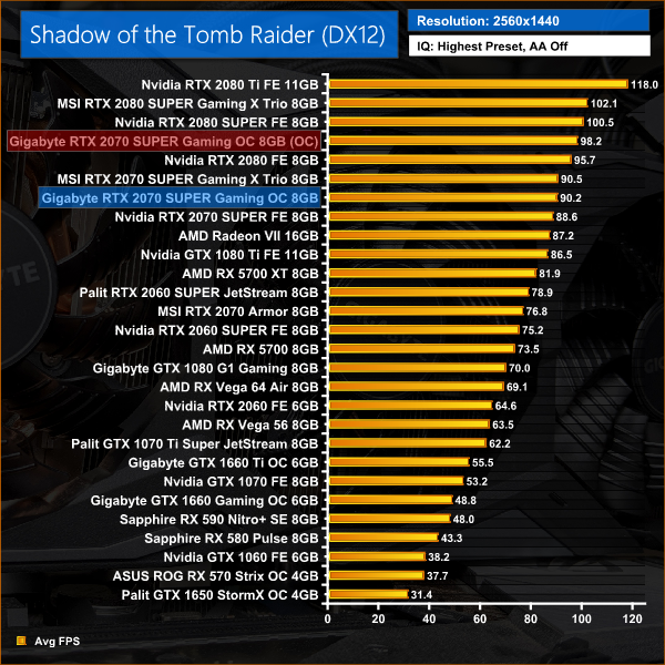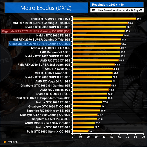 Our 8% increase in clock speed scaled almost perfectly with our increase in frame rates at 1440p – where we saw an average improvement of 9% with this overclock. This puts the 2070 SUPER within touching distance of the 2080 SUPER, and bear in mind that card costs around £160 more than this Gigabyte model.
