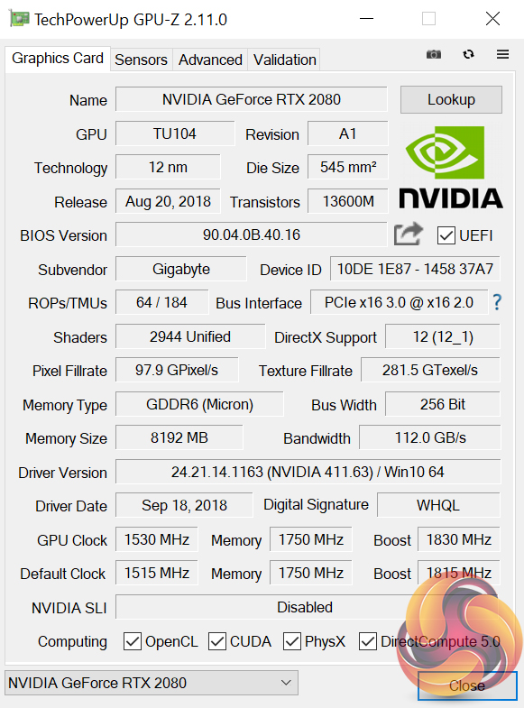 The Gigabyte RTX 2080 Gaming OC 8G shares all the same specs as the Founders Edition RTX 2080 – except one, which is boost clock. As mentioned, the Gigabyte card is clocked at 1815MHz out of the box, when Nvidia's reference speed is 1710MHz. That being said, the Founders Edition card runs at 1800MHz – so this Gigabyte is either +105MHz faster than reference speeds, or just +15MHz faster than the Founders Edition depending on how you look at it.