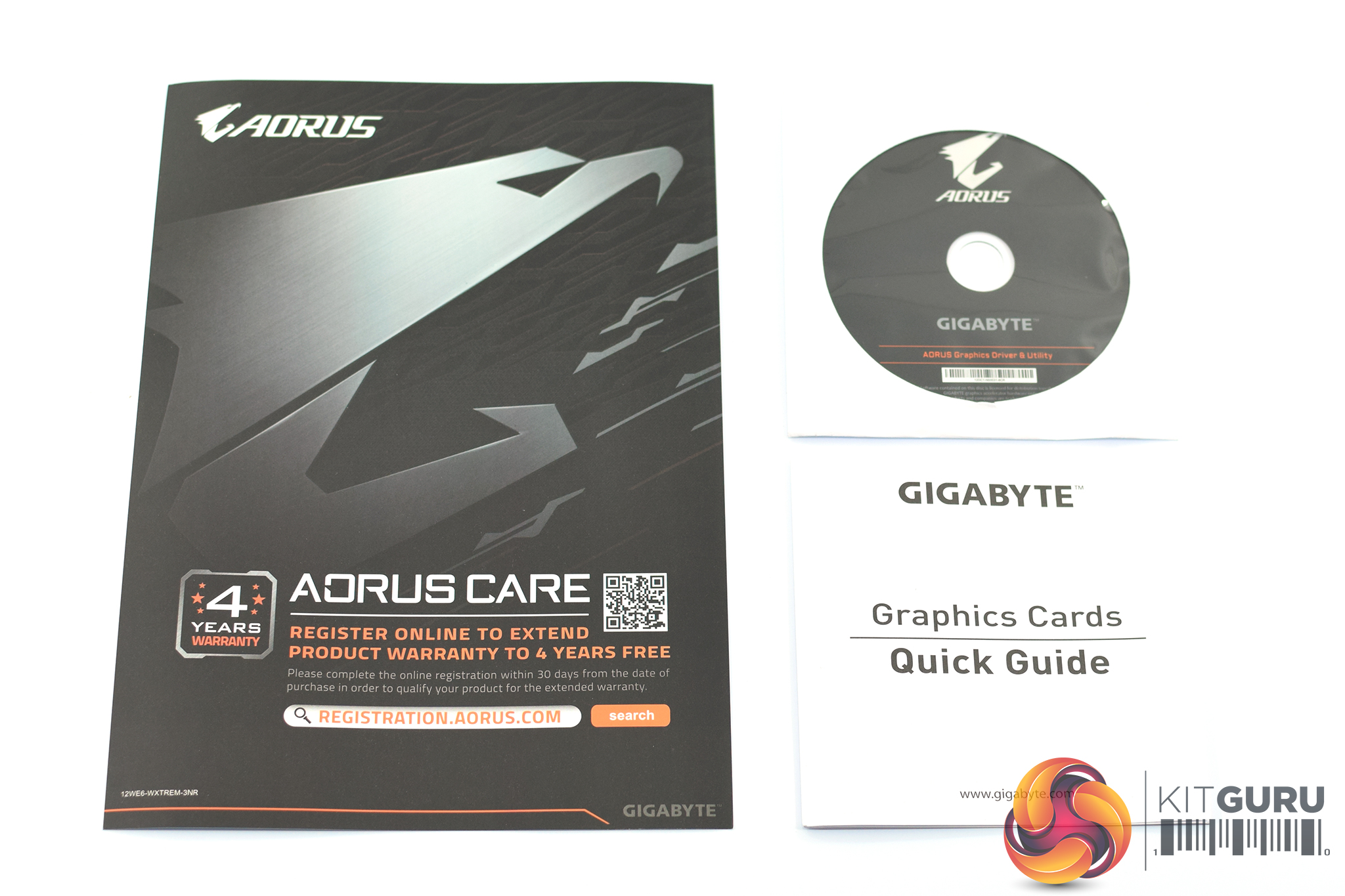Inside the box, we find a somewhat redundant driver/utility disk, as well as one quick start guide. The larger black leaflet lets you know you can get an extra year added onto your warranty for the card by registering it online – a nice touch from Gigabyte.