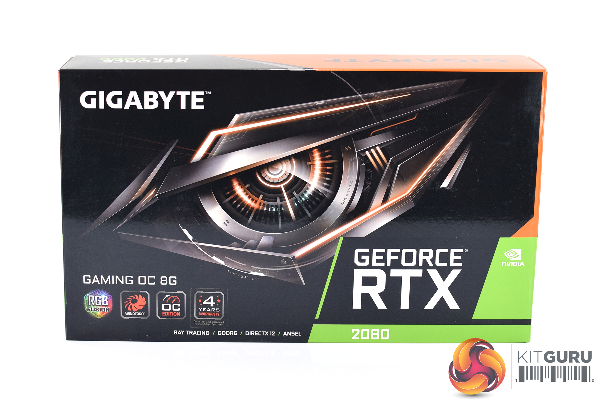 The Gigabyte RTX 2080 Gaming OC 8G ships in a glossy black box, with some kind of mechanical robot eye printed on the front. It is certainly eye catching, if you will excuse the pun.