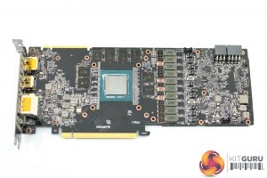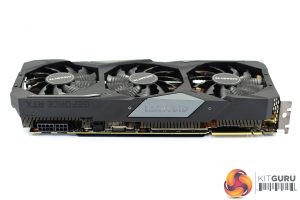 We can also get a look at the triple fan setup here. This is part of the ‘Windforce 3X' cooling solution that the card uses. Each fan measures 82mm in diameter, but interestingly the central fan spins in reverse – i.e. the opposite direction to the two outer fans. Gigabyte says this helps reduce turbulence and thus improve heat dissipation, but we will see how thermal performance is later in the review.
