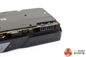 As with the Founders Edition, this Gigabyte Gaming OC card requires 1x 8-pin and 1x 6-pin PCIe power connectors. Gigabyte has also included two white LEDs above these connectors which will turn on if the cables are disconnected, or start blinking if there is not a stable supply of power. No LEDs on = no problems.