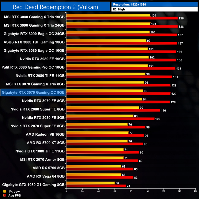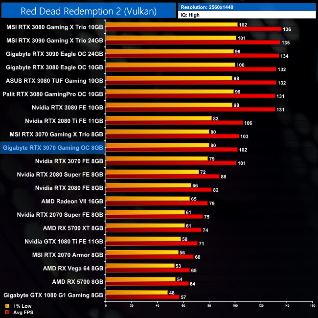 There's not a lot to split between all three RTX 3070s in Red Dead Redemption 2, and this is the only title where the Gaming OC is marginally slower than the Gaming X Trio. The difference is only a single frame at 1440p, though.