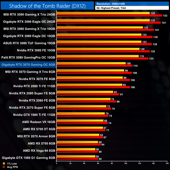The Gaming OC produces its best result in Shadow of the Tomb Raider, when gaming at 4K. At that resolution, it is 5% faster than the Founders Edition, and 2% faster than the Gaming X Trio.