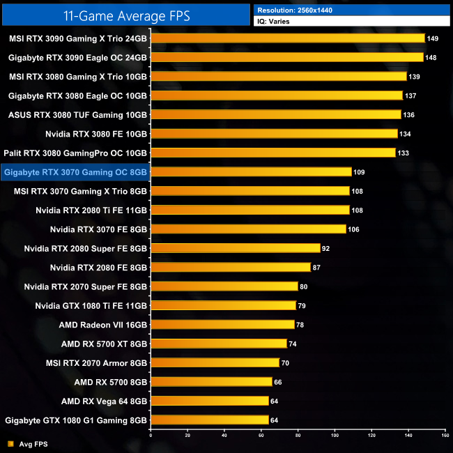 On average, the Gaming OC is 3% faster than Nvidia's Founders Edition at 1440p, and 1% faster than the Gaming X Trio. At 4K, the average frame rate is on level pegging with the Gaming X Trio, so we're clearly not talking any major changes to overall performance.