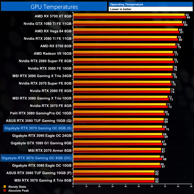 Thermal performance is solid from the Gaming OC. With the OC BIOS, we saw a peak temperature of 68C and a steady state of 66C. Switching to the Silent BIOS adds 2C to both results, simply due to the fact the fans spin slower. Both BIOS run cooler than the Nvidia Founders Edition, but the Gaming X Trio is the coolest-running RTX 3070 we've tested so far.