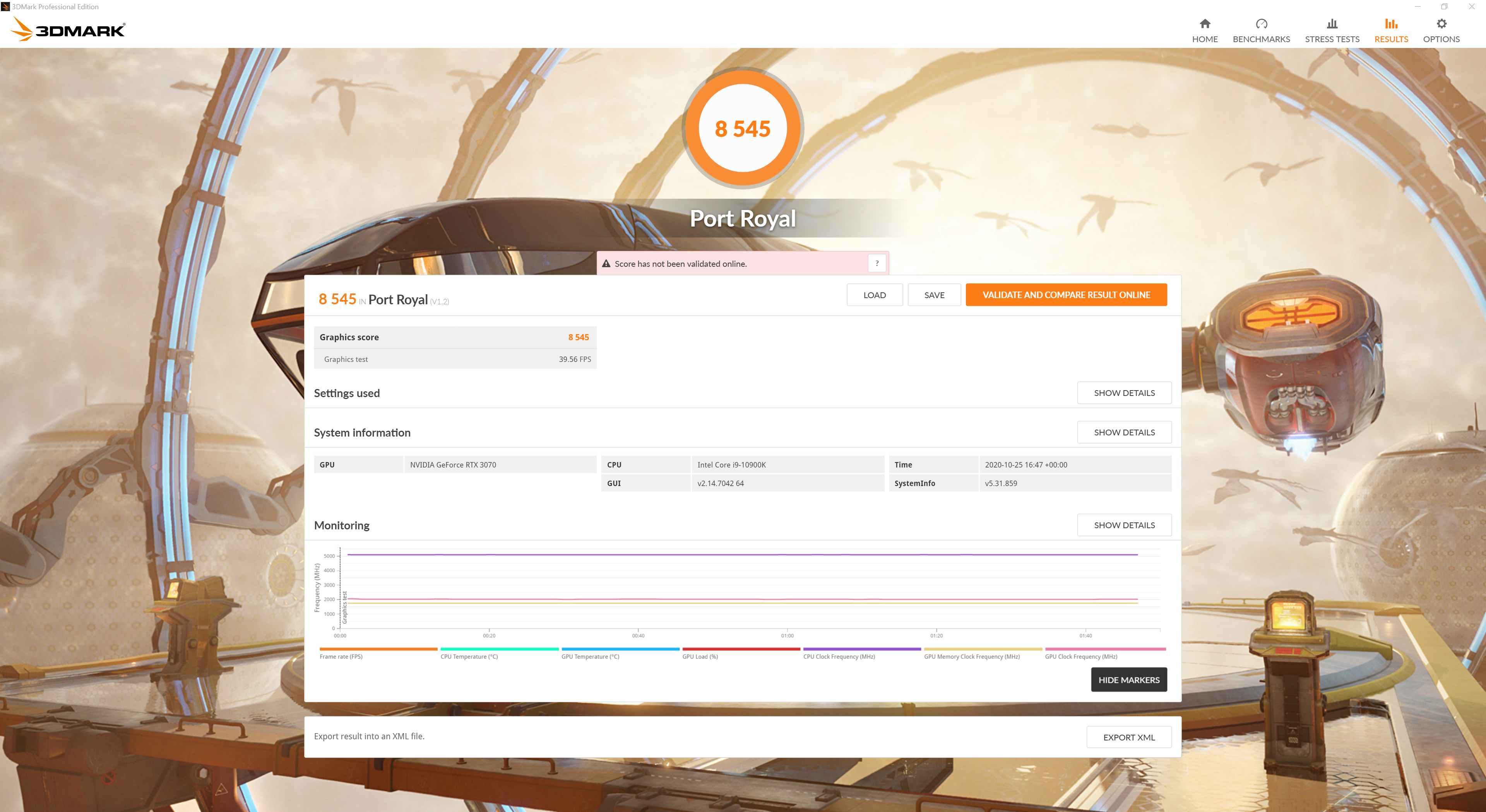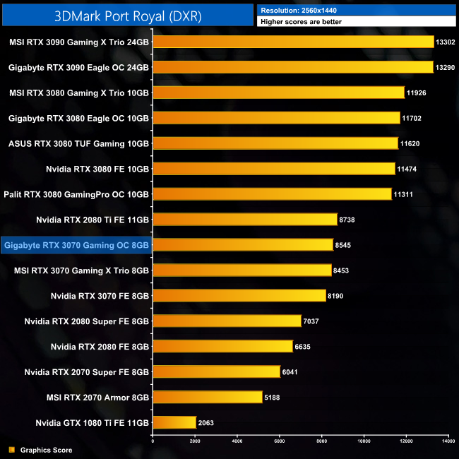 In Port Royal, a hybrid rendered benchmark using rasterisation and ray tracing, the Gaming OC is 1% faster than the MSI RTX 3070 Gaming X Trio, and 4% faster than Nvidia's Founders Edition.