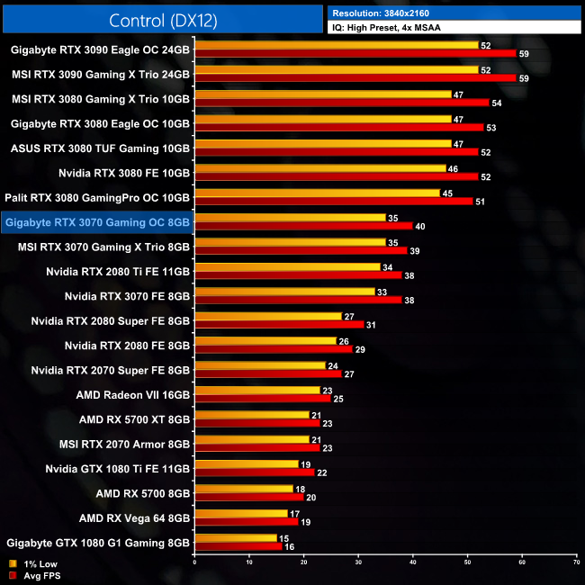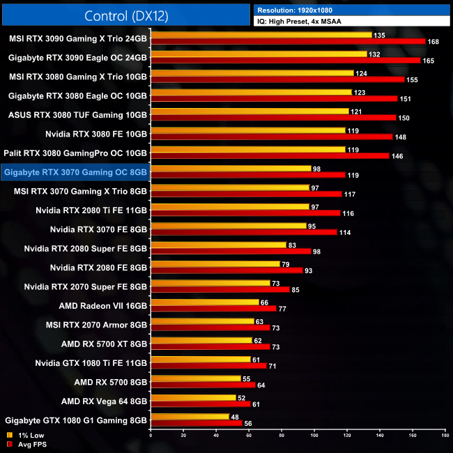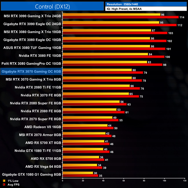 Remedy's Control is the most demanding game in our test suite, with the Gaming OC averaging 79FPS at 1440p. At that resolution, it's 5% faster than Nvidia's Founders Edition.