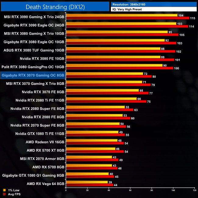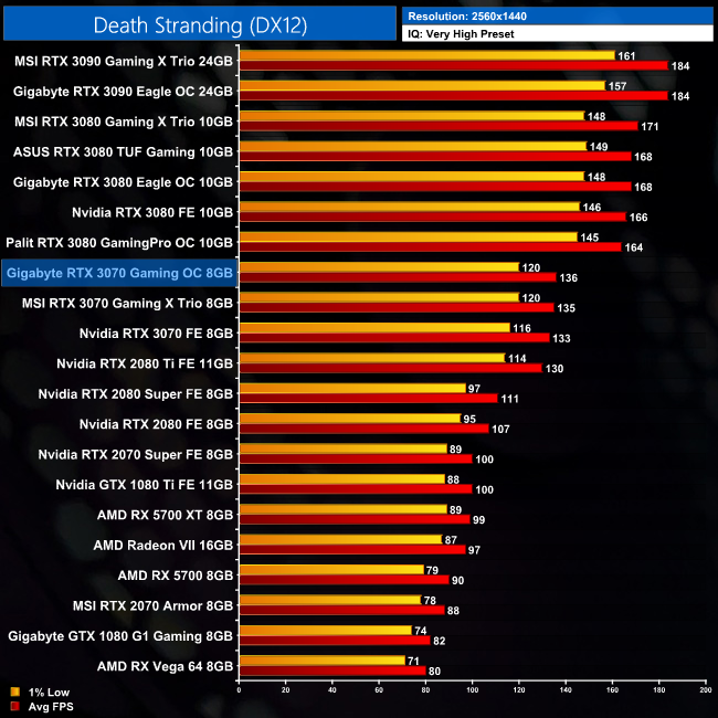 In Death Stranding, the Gaming OC isn't massively faster than the other RTX 3070s in our chart. At 1440p for instance, it's just 2% faster than the Founders Edition, though this does increase to 4% at 4K.
