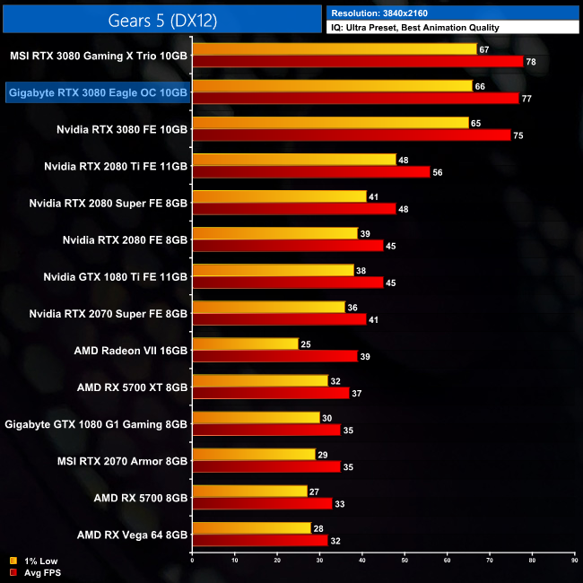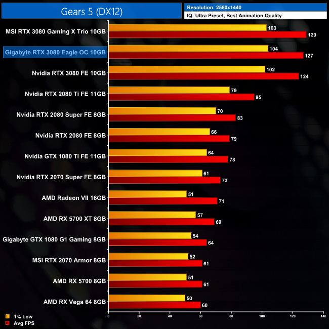 In Gears 5, the relative gains for the 3080 Eagle versus the Founders Edition increase as we step up in resolution. At 1080p, the difference is 1%, while that increases to 2% at 1440p, and finally to 3% at 4K.