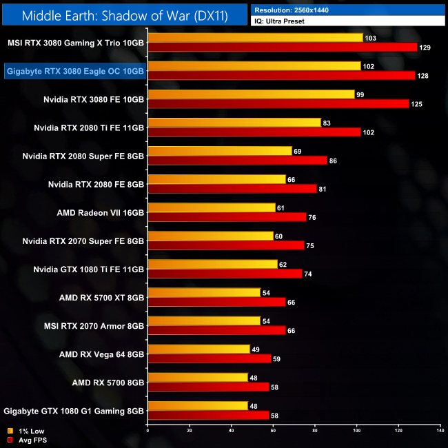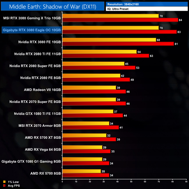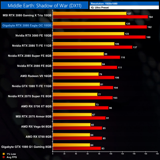 It's another case of the RTX 3080 Eagle seeings bigger gains at the higher resolutions, when testing Shadow of War. It can only improve on the Founders Edition by 1% at 1080p, but this grows (slightly) to a 2% lead at 1440p and 4K.